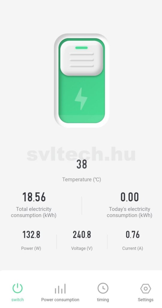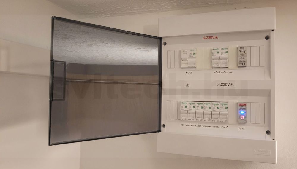 A kivitelezés során külön áramkör került kiépítésre a klímának, a hűtőknek és az előszobai világításnak. Az utóbbi 2 kivételével az egész lakást lehet áramtalanítani egy Tuya Smart kompatibilis okos kapcsolóval akár helyben, akár interneten keresztül, így nem kell aggódni a csatlakoztatva maradt telefontöltők vasaló stb. miatt, energiafogyasztás vagy akár tűzvédelmi szempontból. Természetesen a hűtőgépek továbbra is megkapják a szükséges táplálást.