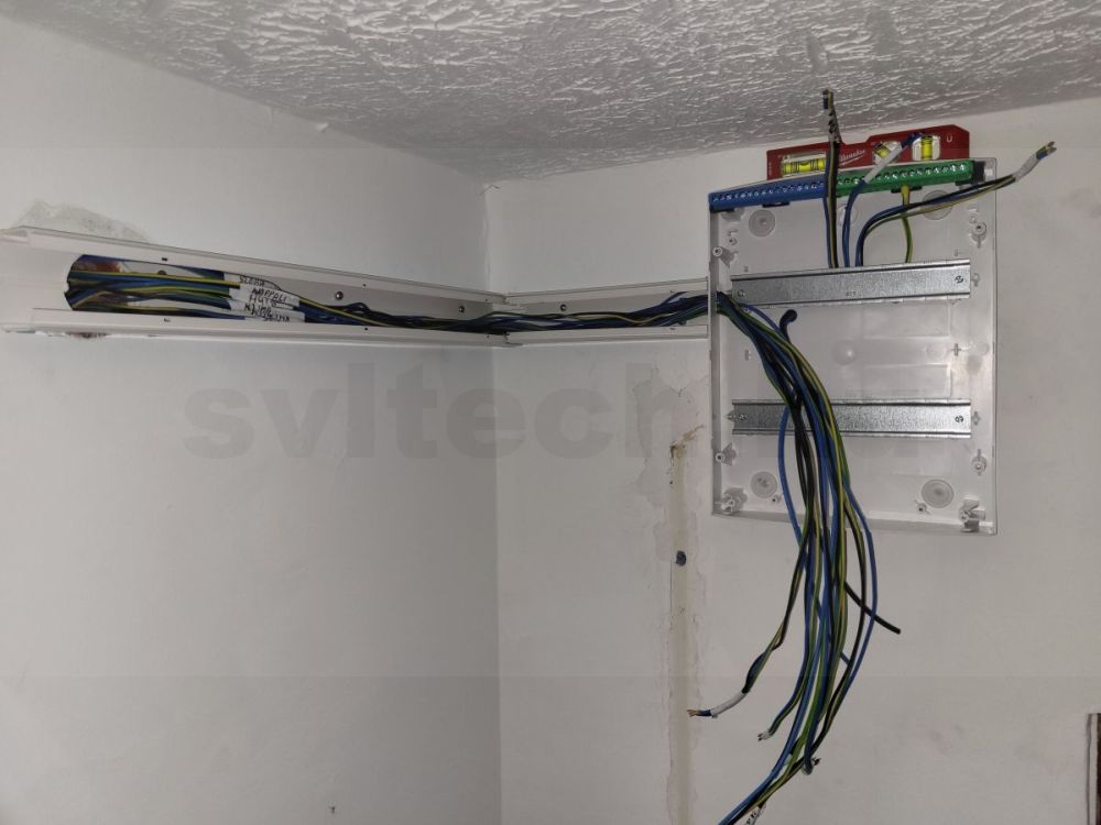Ahol a falban nem volt a régi csövezés átjárható, ott kábelcsatorna került fel, amit LED szalag világítással külön hasznossá sikerült tenni. (panel épületben főfalakat vízszintesen vésni statikai okokból szigorúan tilos)